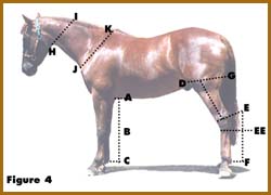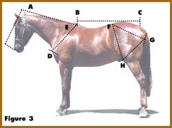 Also characteristic of the Morgan type is the fact that body length (fig.1, C-D) is greater than height at the wither (fig. 1 A-B). This rectangular shape is a hallmark of successful sport horses of all breeds, and is not the result of either short legs or long backs, rather, it comes from a great length and slope of the shoulder and an extremely long, powerful hip, See Figure 3, D-E and F-G. Shoulder lay back is responsible for another Morgan trait in that it causes the neck to rise up out of the body rather than hanging out in front as in some other breeds. The role of a long, sloping shoulder in producing easy gaits and the ability to both raise and extend the forelegs has long been appreciated. The benefits of a long hip and correct rear quarter conformation, while equally important, are less well understood. Mechanically, the front legs bear most of the weight, while the rear legs propel the horse forward; as the engine that drives the horse forward, the rear quarters are of paramount importance in selection the sport horse. As rule of thumb, the triangle formed by the point of the buttocks (fig. 3, G) and the point of the stifle (fig. 3, H) should be roughly equal lateral. This configuration provides the best combination of strength, propulsion, and the ability to reach forward under the body to balance the weight of the horse in motion. Relative shortness on any side of the triangle will seriously impair the animal's athletic ability and long range soundness as a sport horse. The original Morgan was correctly formed in this area as can be seen in Figure 3.